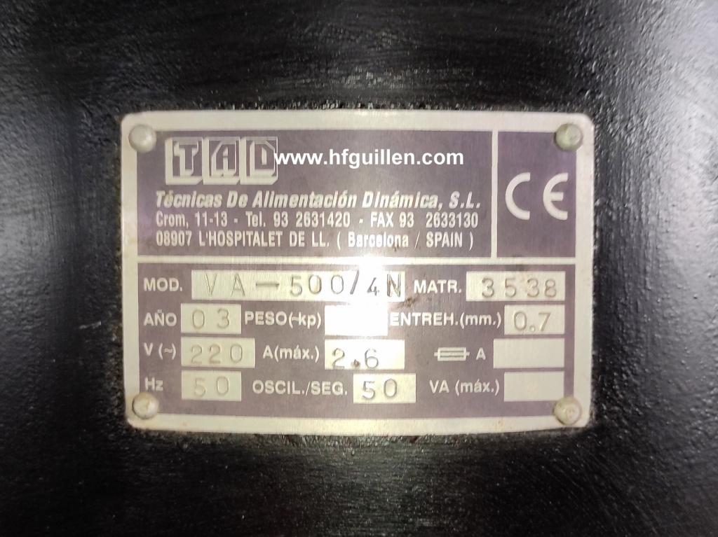 Tienda | VIBRADORES | (REF-1880) – DISTRIBUIDOR ALIMENTADOR DE TAPONES CON BANCADA | Ampliar imagen | Ampliar imagen | Ampliar imagen | Ampliar imagen | ALIMENTADOR DE TAPONES | DISTRIBUIDOR ALIMENTADOR DE TAPONES CON BANCADA | Disponibilidad: | En stock | Código: REF-1880 | REF-1880 DISTRIBUIDOR ALIMENTADOR DE TAPONES CON BANCADA | Fabricante: TAD | Modelo: VA-500/4N | Año: 2003 | Distribuidor/alimentador vibratorio de tapones | Bancada regulable en altura | 220 V/ 50 Hz/ 2,6 A | Diámetro del alimentador: 500 mm | Dimensiones totales: largo 500 mm, ancho 540 mm, alto 1.970 mm | Dimensiones tapones: ø 30 mm, altura 35 mm | Seguir comprando | Imprimir | Enviar | Enviar mensaje