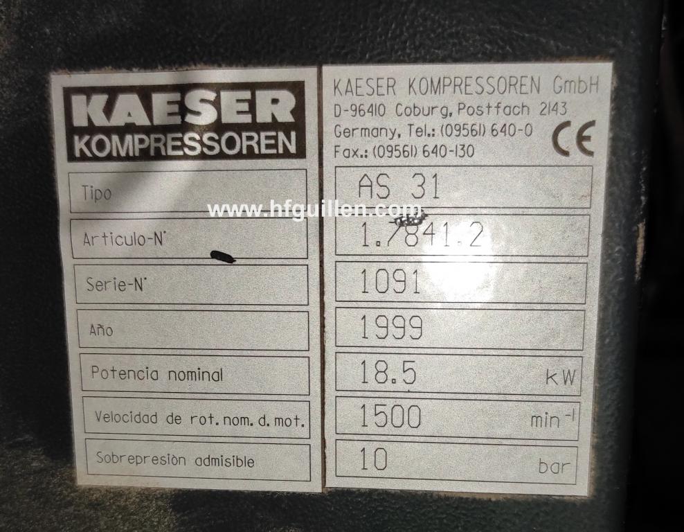 Tienda | COMPRESORES DE AIRE | (REF-0) – COMPRESOR DE AIRE DE TORNILLO KAESER | Ampliar imagen | Ampliar imagen | Ampliar imagen | Ampliar imagen | COMPRESOR DE AIRE DE TORNILLO KAESER | Disponibilidad: | En stock | Código: REF-0 | REF-0 COMPRESOR DE AIRE DE TORNILLO KAESER | Compresor de aire comprimido de tornillo. | Marca: Kaeser | Tipo: AS 31 | Año: 1999 | Potencia: 18,5 kW / 25 CV | Sobrepresión máxima: 10 bar | Caudal máximo: 115 cfm / 3,25 m3/min | Dimensiones: largo 200 cm, ancho 80 cm, altura 108 cm | Seguir comprando | Imprimir | Enviar | Enviar mensaje