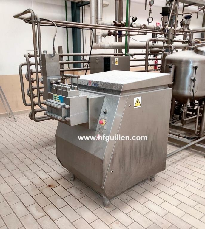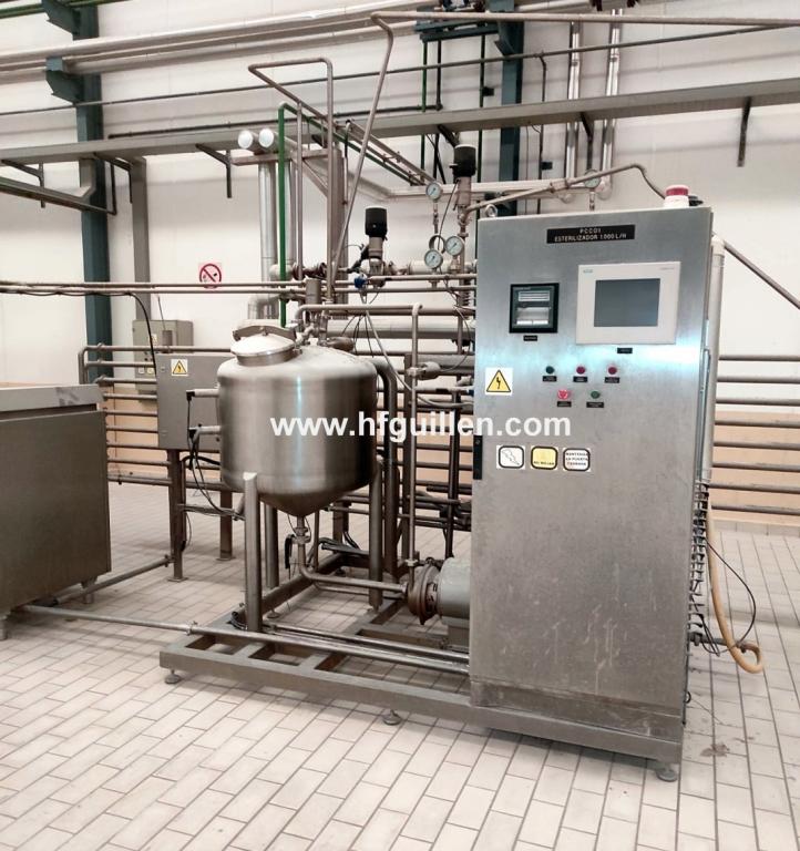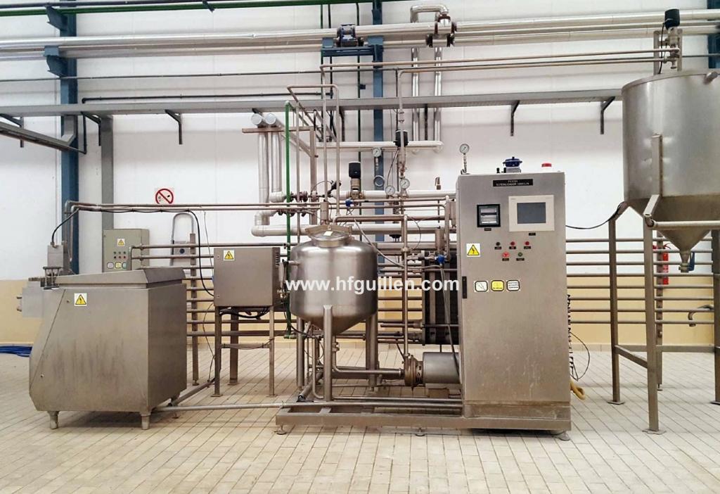 Tienda | PASTEURIZADORES, ESTERILIZADORES | (REF-0) – ESTERILIZADOR APV DE LÍQUIDO DE PESCADO 1.000 LITROS/HORA | Ampliar imagen | Ampliar imagen | Ampliar imagen | Ampliar imagen | ESTERILIZADOR PASTEURIZADOR APV | ESTERILIZADOR APV DE LÍQUIDO DE PESCADO 1.000 LITROS/HORA | Disponibilidad: | En stock | Código: REF-0 | REF-0 ESTERILIZADOR APV DE LÍQUIDO DE PESCADO 1.000 LITROS/HORA | Planta diseñada para la pasteurización automática de 1.000 litros/hora de líquido de pescado troceado y tamizado para su posterior envasado. | Fabricante: APV | Año: 2002 | FUNCIONAMIENTO: | Temperatura de alimentación: 20 °C | Temperatura de tratamiento: 105 °C | Temperatura de salida a envase: 35 °C | El procedimiento comprende distintas fases programables desde el cuadro de control: | Esterilización: se realiza mediante la circulación durante 30 minutos de agua caliente a una temperatura de 115-120 °C. | Producción con agua: se abre el agua de refrigeración hasta alcanzar la temperatura de tratamiento que se usará con el producto. | Producción: el producto sin tratar entra en el tanque regulador y, a continuación, se ejecuta la secuencia de producción en el circuito. | Limpieza: la instalación se limpia “in situ” por recirculación de detergentes vertidos manualmente en el tanque regulador y calentados mediante la sección de calefacción. | COMPONENTES DE LA PLANTA: | Tanque regulador cerrado | de 200 litros en acero inox. AISI 304 con tres sondas de nivel máximo, medio y mínimo. | Bomba de impulsión centrífuga | APV modelo W+50/8 para 1.000 l/h con motor de 3 kW. Todas las partes en contacto con el producto son de acero inox. AISI 316. | Homogeneizador | de simple etapa marca Gaulin modelo 15-3.0 B. | Capacidad de 1.000 l/h, temperatura máxima 50 °C, presión de homogeneización 200 bar. | Con motor eléctrico de 11 kW/3×380 V/50 Hz. | Construido en acero inoxidable, y algunas partes en AISI 316. | El producto sale del intercambiador de calor de placas a unos 50-55 °C y va al homogeneizador, donde es sometido a una presión de 180-200 bar, y posteriormente regresa al intercambiador para terminar el tratamiento térmico. | Intercambiador de calor de placas | APV | modelo H17. | Diseñado para calentar 1.000 l/h de líquido desde 20 °C hasta 110 °C y su posterior enfriamiento hasta 35 °C. | Presión de trabajo 10 bar, temperatura de diseño 130 °C. | Placas de acero inox. AISI 316 con juntas de EPDM y bastidor en AISI 304. | Unidad de mantenimiento. | Diseñada para conseguir que el producto permanezca 3 minutos a la temperatura de pasteurización. Está formada por tramos de tubo pulido de acero inox. AISI 316 soldados entre sí y montados sobre un bastidor de acero inox. Puede acortarse para reducir el tiempo de mantenimiento a 1,5 minutos. | Equipo de producción de agua caliente. | Incluye bomba centrífuga APV modelo W+10/8 con motor de 0,75 kW. | Interconexión general | de la planta de esterilización compuesta por diversas válvulas, tuberías de acero inox., mirilla para el control visual, etc. | Panel de control automático | en el que están alojados PLC para control automático de la planta, programación de las diferentes fases, pantalla de visualización, registrador de temperaturas, arrancadores para todos los motores y elementos eléctricos y neumáticos necesarios. | NOTA: | El homogeneizador Gaulin 15-3.0 B y el intercambiador de placas APV H17 también pueden adquirirse por separado del resto de la planta. | Seguir comprando | Imprimir | Enviar | Enviar mensaje