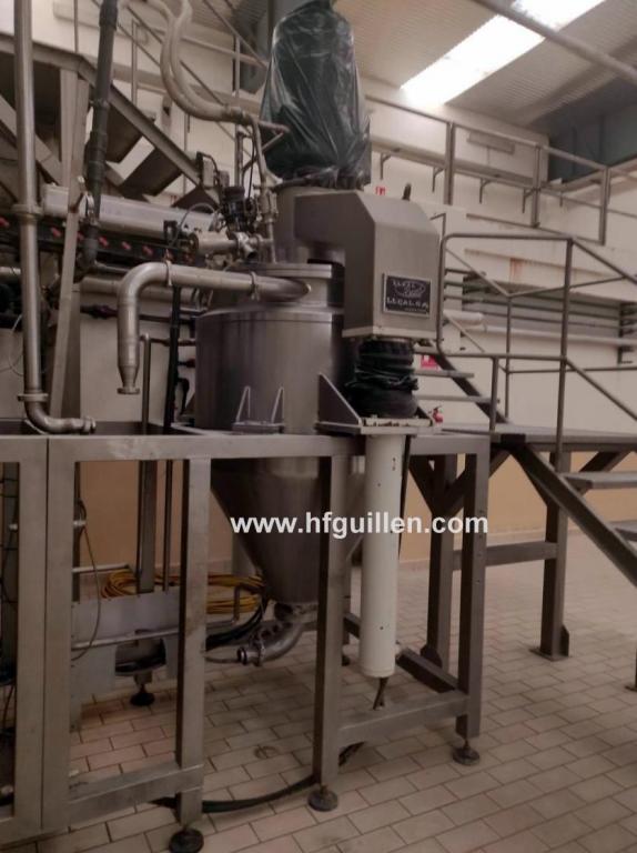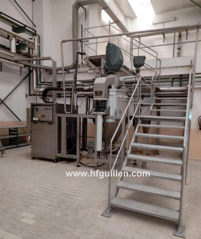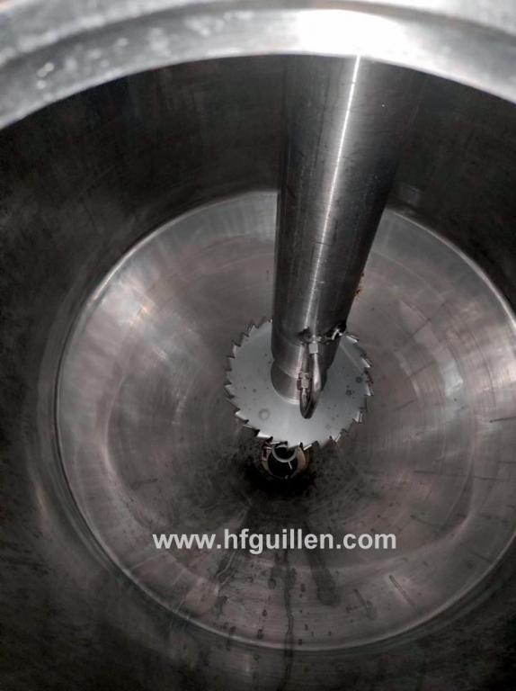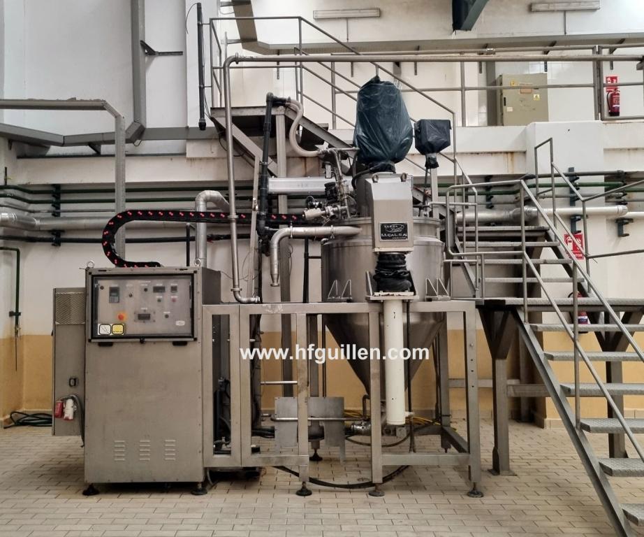 Tienda | MEZCLADORAS DE SÓLIDOS Y LÍQUIDOS | (REF-2704) – MEZCLADOR AL VACÍO PARA PRODUCTOS LÍQUIDOS Y VISCOSOS LLEAL MAX-MIX MM-500 | Ampliar imagen | Ampliar imagen | Ampliar imagen | Ampliar imagen | LLEAL MAX-MIX MM-500 | MEZCLADOR AL VACÍO PARA PRODUCTOS LÍQUIDOS Y VISCOSOS LLEAL MAX-MIX MM-500 | Disponibilidad: | En stock | Código: REF-2704 | REF-2704 MEZCLADOR AL VACÍO PARA PRODUCTOS LÍQUIDOS Y VISCOSOS LLEAL MAX-MIX MM-500 | Fabricante: LLEAL | Modelo: MAX-MIX MM-500 | Año: 2000 | N.º de fabricación: 14890 | Serie: 3712 | Datos eléctricos: 49,8 kW/380 V/104 A/3+N+T/50 Hz | Equipo de mezcla, dispersión, emulsión y homogeneización MAX-MIX modelo MM500. | El centro de procesos MAX-MIX es un equipo multifunción ideal para la fabricación de productos líquidos y viscosos que, para su elaboración, necesiten fases de dispersión, homogeneización y emulsión (en procesos sólido/líquido y líquido/líquido) y que además requieran un acabado totalmente desaireado al trabajar con vacío interior. | El proceso se complementa con la posibilidad de calentamiento o enfriamiento del producto durante su elaboración, con la carga de sólidos y líquidos por vacío y con la recirculación y descarga por desplazamiento positivo sin ayuda exterior. | El MAX-MIX permite la preparación de pastas finas dispersadas con finuras de hasta 15 micras de tamaño de partícula, y consiguiendo microemulsiones de hasta 1 micra utilizando el molino coloidal horizontal MCH-5 (*) ubicado en la parte inferior. | El MAX-MIX MM-500 cuenta con un depósito de mezcla cilíndrico en acero inoxidable AISI-316 con fondo troncocónico, de capacidad útil 500 litros y volumen total 700 litros. Está construido para poder trabajar con vacío. Dispone de una doble cámara tipo serpentín de media caña para calentamiento o enfriamiento, timbrada para trabajar a un máximo de 2 bar de presión. | El depósito está dotado de dos equipos de agitación: | − Agitación lenta: áncora en el interior del depósito accionada por motorreductor con variador electrónico de frecuencia de 3 CV y 0 – 50 RPM. | − Agitación rápida: turbina tipo cowles en la zona central del depósito accionada por motor de 40 CV con velocidad regulable de 0 a 2.000 RPM. | El MAX-MIX dispone también de un sistema de recirculación que permite el paso del producto a través del molino coloidal MCH-5 (*), la incorporación de aditivos al proceso mediante vacío y la descarga del producto final. | (*) IMPORTANTE: Este mezclador MAX-MIX se vende sin el molino coloidal MCH-5 que iría en la parte inferior, el cual podrá adquirirse directamente del fabricante. La cotización por este equipo se referirá a su estado actual sin incluir el molino coloidal MCH-5. | Seguir comprando | Imprimir | Enviar | Enviar mensaje