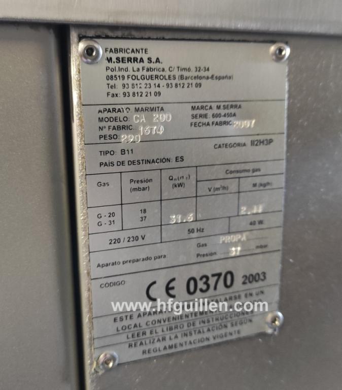 Tienda | MARMITAS, PEROLES Y BACINAS | (REF-0) – MARMITA A GAS M. SERRA CA-200 | Ampliar imagen | Ampliar imagen | Ampliar imagen | Ampliar imagen | MARMITA A GAS M. SERRA CA-200 | Disponibilidad: | En stock | Código: REF-0 | REF-0 MARMITA A GAS M. SERRA CA-200 | Fabricante: M. SERRA | Modelo: CA-200 | N.º serie: 1674 | Año: 2007 | Capacidad: 200 litros | Potencia: 31,6 kW | Gas: propano | Consumo de gas: 2,44 kg/h | Presión: 37 mbar | Tensión: 220/230 V | Medidas totales: Ancho 110 cm, largo 110 cm, alto 105 cm | Medidas internas: Ancho 59,5 cm, largo 60 cm, alto 59 cm | Seguir comprando | Imprimir | Enviar | Enviar mensaje