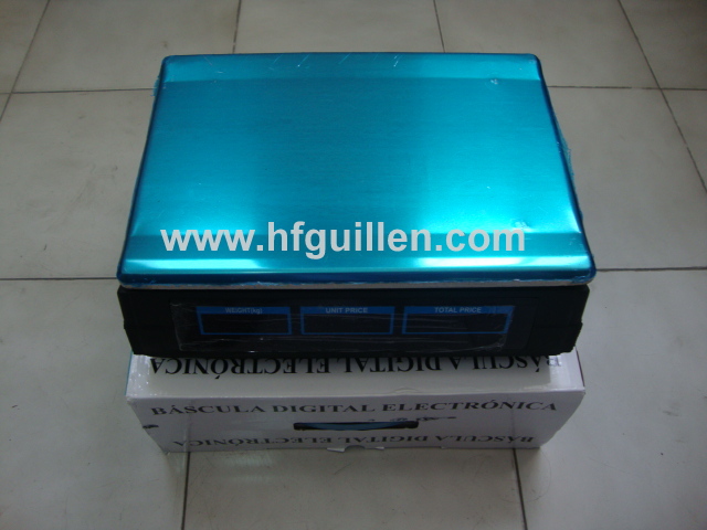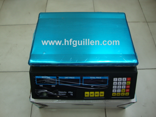REF-0 BÁSCULA DIGITAL 40 KG | Báscula digital con plato en acero inoxidable de 350 x 350 mm. | Cubierta y base de plástico. | Display luminoso de LED rojos. | Funciones de peso, precio, total a pagar, tara, 8 memorias. | Directas por teclado, suma de productos pesados y teclado de fácil acceso. | Alcance máximo: 40 kg | Alcance mínimo: 100 g | División de verificación 5 g | 220 V/50 Hz/10 W | Batería recargable de 6 VCD 4 AMP. Hora. | Temperatura de operación: 0-40 | ° | C | Humedad hasta 85% RH. | Marcado CE. | BÁSCULA DIGITAL 40 KG (NUEVA) | Volver al listado | Imprimir | Enviar