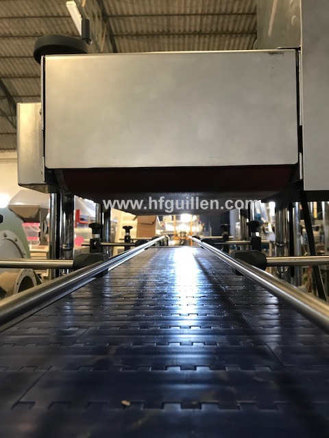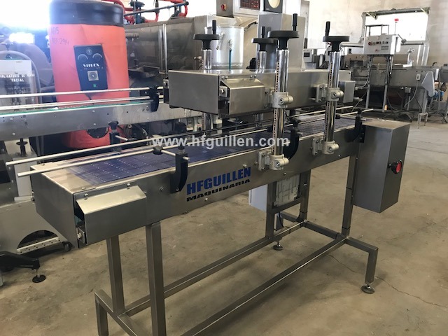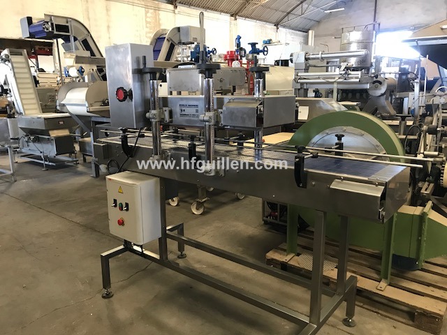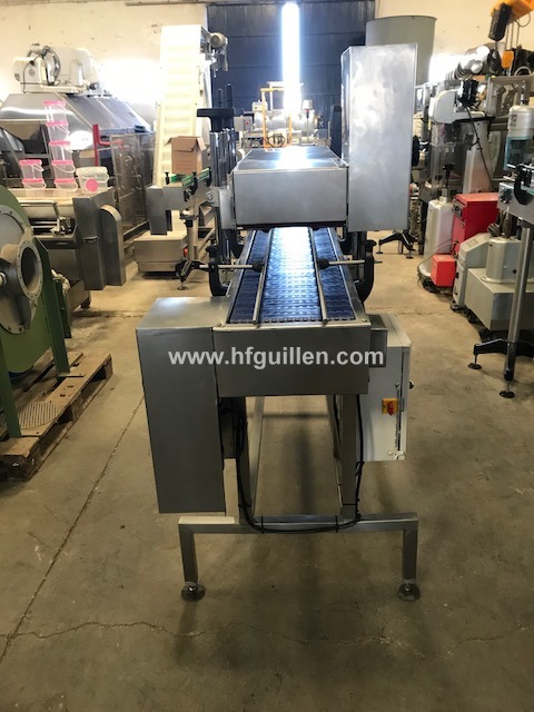 REF-0 CERRADORA DE TARRINAS POR PRESIÓN (NUEVA) | Marca: HIJOS DE FRANCISCO GUILLÉN S.L. | Fabricada totalmente nueva por encargo. | Tensión: 380V. Trifásica. | 2 motovariadores mecánicos. | Cerradora a presión consistente en 1 transportador de charnela superpuesto sobre otro, este último instalado con ligera inclinación de mayor a menor para así conseguir el apriete necesario para el cierre de la tarrina. | El transportador dispone de sistema de regulación en función de la altura de la tarrina mediante husillos montados en sus laterales. | Las guías laterales son de varilla de 12mm y soportes de barandilla para la regulación del ancho. | El cuadro eléctrico de maniobra es totalmente estanco y de poliéster. | Dimensiones totales: ancho 600mm, largo 2.000mm, alto 1.400mm. | CERRADORA DE TARRINAS POR PRESIÓN (NUEVA) | Volver al listado | Imprimir | Enviar