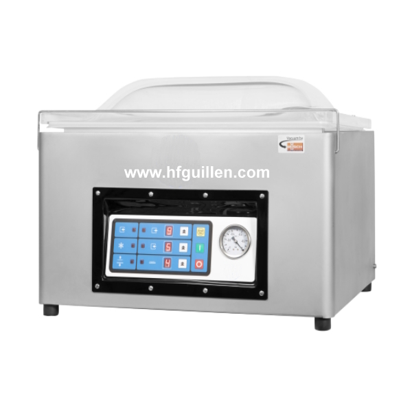 REF-0 ENVASADORA AL VACÍO DE SOBREMESA 580mm (NUEVA) | • Construida totalmente en acero inoxidable AISI 304. | • Tapa transparente. | • Entrada de aire en atmósfera progresiva (Soft Air). | • Fácil desmontaje de las barras de soldadura. | • Equipada con gruesos de polietileno para un envasado más rápido y fácil colocación de bolsas. | • Fácil mantenimiento. | • Bomba BUSCH de 20 m³/h. | • Voltaje: 230V/monofásica/50Hz. | • Potencia: 1,02CV/0,75kW. | • Soldadura neumática (sin cables). | • Soldadura doble. (Opcional: soldadura simple con corte del sobrante) | • Panel de control digital. (Opcional: panel de control digital por sensor.) | • Dimensiones totales: ancho 640mm, largo 580mm, alto 470mm. | • Peso neto/bruto (kg): 81/95. | • Dimensiones de la cámara: 580×450×180mm. | • Barras de soldadura disponibles en diferentes disposiciones y medidas (vid. la última imagen). | • Opcional: Entrada de gas inerte. | • Accesorios: | – Placa inclinada para envasar productos líquidos o salsas. | – Conector para vacío en cubetas externas. | REF-0 ENVASADORA AL VACÍO DE SOBREMESA 580mm (NUEVA) | Volver al listado | Imprimir | Enviar