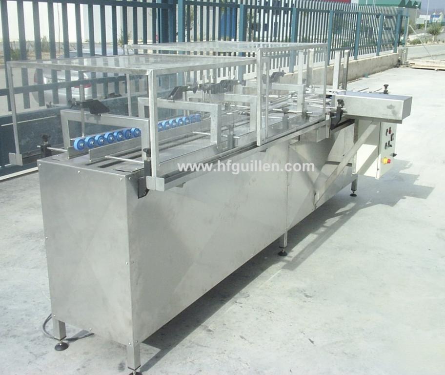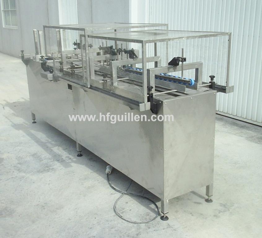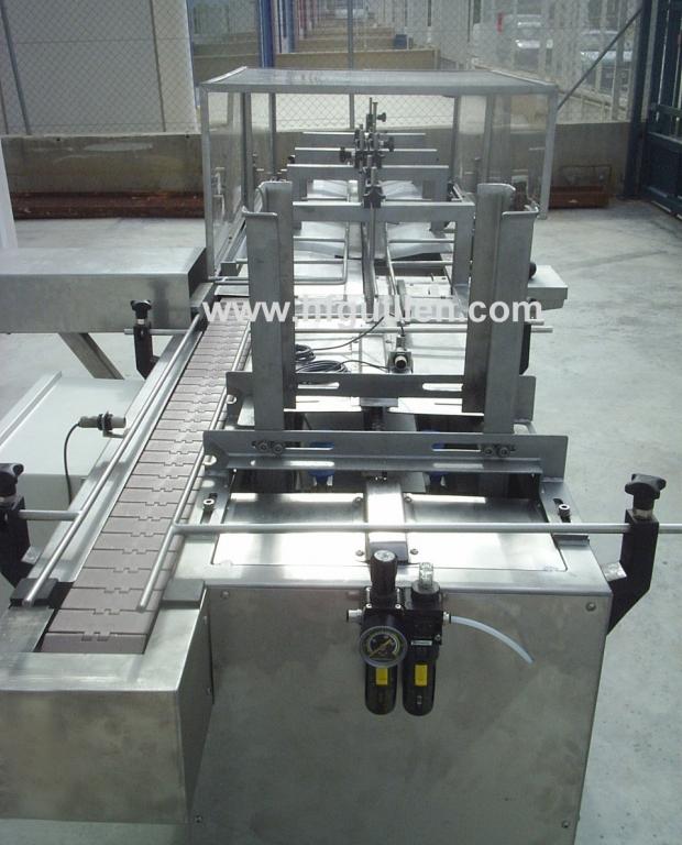 REF-0 ESTUCHADORA DE PACKS DE 3 UNIDADES (NUEVA) | Máquina formadora de packs de 3 unidades fabricada nueva. | Construida totalmente en acero inoxidable. | Capacidad: 40-50 packs por minuto. | Motor de 1,5 CV con variador de velocidad. | Alimentada por aire. Consumo de aire: 1,2kg. | CV totales: 2,2. | Estructura de seguridad en acero inoxidable y metacrilato. | Dos resistencias para alimentar el cazo de cola caliente de 600W. | Torre de alimentación de cartón regulable a varios formatos. | Cuadro de poliéster puesta en marcha. | Dimensiones totales: largo 3.700mm, ancho 800mm, alto 900mm. | Normativa CE. | REF-0 ESTUCHADORA DE PACKS DE 3 UNIDADES (NUEVA) | Volver al listado | Imprimir | Enviar