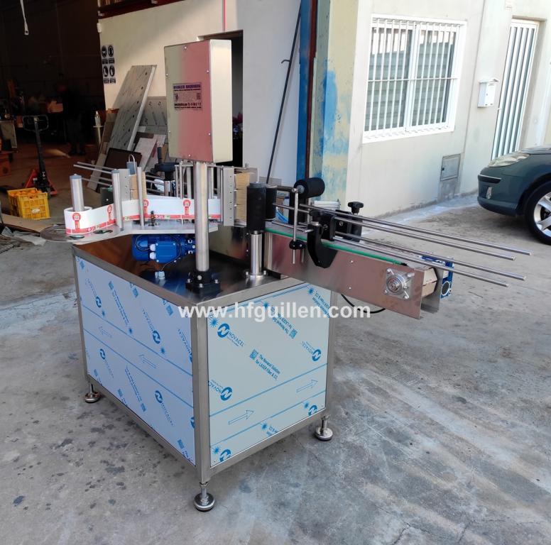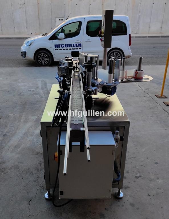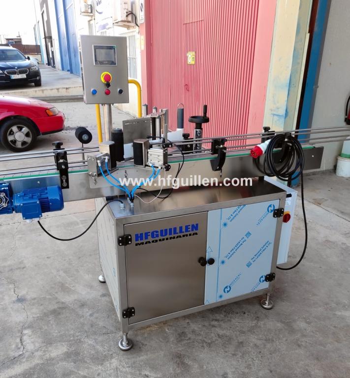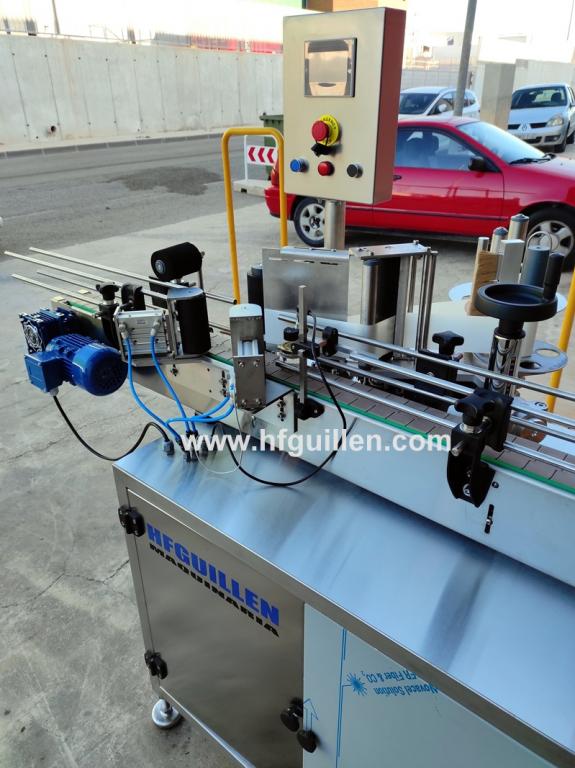 REF-0 ETIQUETADORA AUTOMÁTICA ADHESIVA 1 CABEZAL CON PINZA Y CHAFADOR DE PRECINTO (NUEVA) | ETIQUETADORA AUTOMÁTICA ADHESIVA 1 CABEZAL CON PINZA Y CHAFADOR DE PRECINTO | Diseñada para etiquetar botellas, tarros, botes (envases redondos) con etiqueta autoadhesiva. Totalmente automática. | Dispone de un cabezal de etiquetado, pinza y chafador de precinto de garantía. | Se fabrica nueva por encargo. | Marca: HFGUILLEN MAQUINARIA. | Producción: 50-60 envases/minuto. | Compuesta por: | • mesa de acero inox. sobre la que va la etiquetadora | • cinta transportadora de charnela de 80 mm ajustable al ancho del envase | • cuadro eléctrico | Dimensiones totales: largo 2.000 mm, ancho 1.100 mm, alto 1.650 mm | REF-0 ETIQUETADORA AUTOMÁTICA ADHESIVA 1 CABEZAL CON PINZA Y CHAFADOR DE PRECINTO (NUEVA) | Volver al listado | Imprimir | Enviar