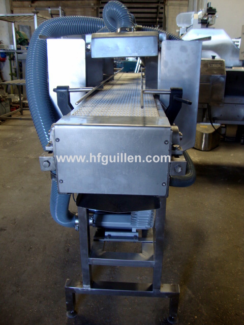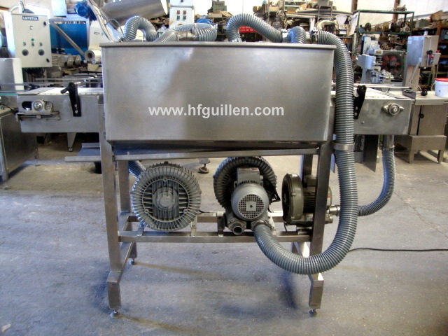 REF-0 SECADORA DE TARRINAS ALTA PRESIÓN DOS FASES (NUEVA) | SE FABRICA NUEVA POR ENCARGO. | Fabricada en acero inoxidable AISI 304. | Chasis construido en tubo cuadrado de 40 x 40 x 1 mm. | Un electro ventilador de alta presión para secado del tarro. | Sistema de secado mediante haz de boquillas difusoras dispuestas en sus laterales y en su parte superior alimentadas por electro ventiladores de alta presión. | Banda de transporte tipo EUROBELT de la serie 50 FLUHSGRID con perforación del 40%. | Secadora cerrada en todo su contorno para evitar derrames. | Recogida de agua mediante bandeja instalada en la parte inferior. | Motor reductor variador de 1 CV y 2 ventiladores de 2 CV. | Dimensiones de la cinta: largo 2.000 mm, altura 950 mm | Dimensiones totales: largo 2.000 mm, ancho 600 mm, alto (aprox.) 1.500 mm | VIDEO: | https://www.youtube.com/watch?v=m5aBHgOERSo | REF-0 SECADORA DE TARRINAS ALTA PRESIÓN DOS FASES (NUEVA) | Volver al listado | Imprimir | Enviar