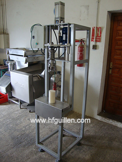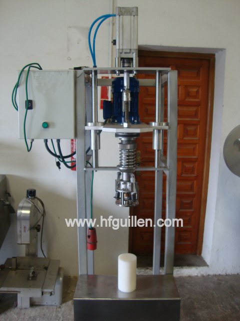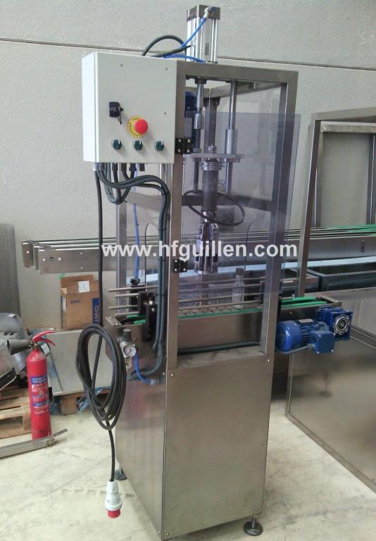 REF-0 TAPONADORA PILFER SEMIAUTOMATICA (NUEVA) | Se fabrica nueva por encargo. | Estructura de fundición. | Tiene un motor de 0,09kW. 380V. Corriente trifásica. | Con cuadro eléctrico. | Consta de un cabezal cerrado para tapón pilfer de 3 rulinas. | Lleva un cilindro neumático que hacer subir y bajar el cabezal. | Base para posicionar botellas. | Funcionamiento: | – Colocar la botella con tapón en la base. | – Pulsar el botón de maniobra. | – El cabezal pilfer baja, cierra el tapón y vuelve a subir. | Dimensiones totales: ancho 600mm, largo 700mm, alto 2.100mm. | REF-0 TAPONADORA PILFER SEMIAUTOMÁTICA (NUEVA) | Volver al listado | Imprimir | Enviar