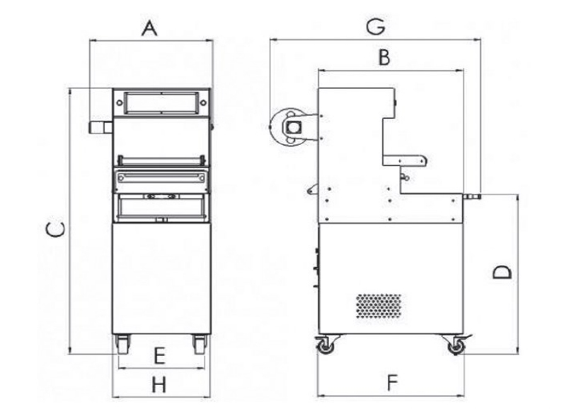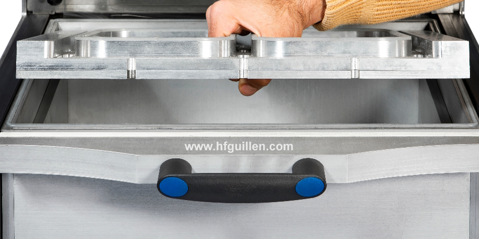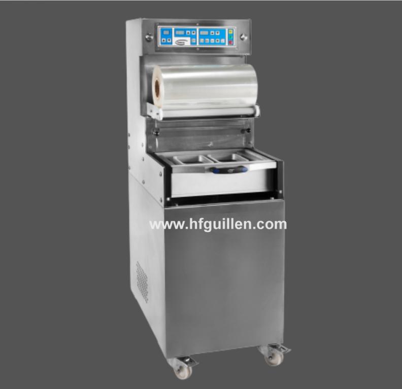 REF-0 TERMOSELLADORA AUTOMÁTICA DE BANDEJAS CON VACÍO Y BARRIDO DE GAS 320×260mm (NUEVA) | • Selladora automática de bandejas o barquetas. | • Construida en acero inoxidable AISI 304. | • Moldes en aluminio anodizado. | • Modelo ergonómico y robusto. | • Fácil cambio de moldes en pocos segundos. | • Rápido calentamiento a la temperatura seleccionada. | • Permite trabajar con diferentes tipos de materiales de bandejas como PP, PET, aluminio, etc. | • Bomba Busch de 20 m³/h. | • Fácil limpieza y mantenimiento. | • Panel de control digital con 99 programas de memoria. | • Control de vacío por sensor. | • Control de entrada de gas por sensor. | • Regulación de la temperatura de sellado. | • Regulación del tiempo de sellado. | • Botón VAC-STOP: finaliza el vacío, pero continúa el proceso. | • Botón de control de mantenimiento. | • Seguimiento paso a paso del ciclo mediante leds. | • Accionamiento neumático de cuchilla y placa de soldar. | • Requiere aire comprimido. | • Datos eléctricos: 400 V/trifásica/50 Hz. | • Superficie máxima de sellado: 320×260 mm. | • Ancho bobina de film: 400 mm. | • Potencia: 1.500 W. | • Peso neto/bruto (kg): 142/150. | • Moldes estándar: | – 1/2 GN (320×260 mm) – 1 cavidad | – 1/4 GN (160×260mm) – 2 cavidades | – 1/8 GN (168×130mm) – 4 cavidades | Dos opciones de corte del film: corte por la parte trasera de la bandeja o corte perimetral ajustado al contorno de la bandeja. | Se puede fabricar cualquier tipo y forma de molde acorde con las bandejas del cliente. | Opciones: 1) Bomba BUSCH de 40 m³/h; 2) Bomba BUSCH de 20 m³/h para oxígeno superior al 21%. | • Dimensiones (en milímetros): | A | B | C | D | E | F | G | 610 | 730 | 1.490 | 890 | 395 | 1.115 | 495 | Vid. última imagen. | REF-0 TERMOSELLADORA AUTOMÁTICA DE BANDEJAS CON VACÍO Y BARRIDO DE GAS 320×260mm (NUEVA) | Volver al listado | Imprimir | Enviar