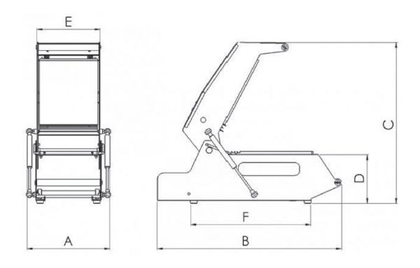REF-0 TERMOSELLADORA MANUAL DE BANDEJAS 210×155mm (NUEVA) | • Termoselladora manual de bandejas. | • Construida en acero inoxidable AISI 304. | • Moldes en aluminio anodizado. | • Corta el film por la parte trasera. | • Panel digital con regulador de temperatura de sellado (0°C-230°C). | • Modelo ergonómico y robusto. | • Fácil cambio de molde en pocos segundos. | • Fácil y rápido calentamiento de la máquina. | • Permite trabajar con diferentes tipos de materiales de bandejas como | PP, PET, aluminio, etc. | • Datos eléctricos: 220V/monofásica/50Hz. | • Superficie máxima de sellado: 210×155mm. | • Ancho bobina de film: 150mm. | • Potencia: 900W. | • Peso neto/bruto (kg): 8/10. | • Incluye molde de 137×192mm. | Molde estándar: | – 137×96mm (2 barquetas). | – 1/8 GN (168×130mm). | Se puede fabricar cualquier tipo y forma de molde acorde con las bandejas del cliente. | Dimensiones (en milímetros): | A | B | C | D | E | F | 270 | 570 | 515 | 152 | 193 | 355 | Vid. última imagen. | REF-0 TERMOSELLADORA MANUAL DE BANDEJAS 210×155mm (NUEVA) | Volver al listado | Imprimir | Enviar