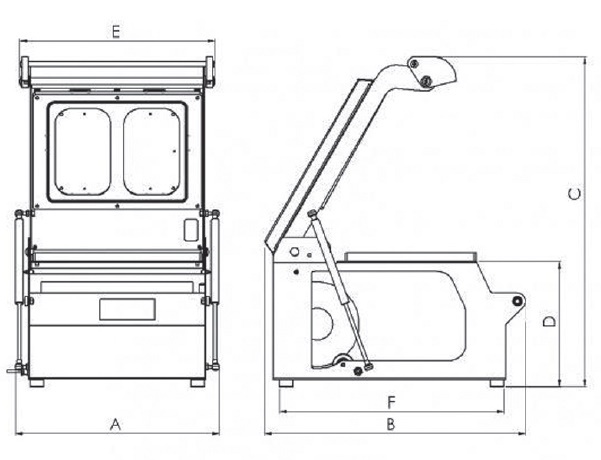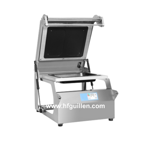REF-0 TERMOSELLADORA MANUAL DE BANDEJAS 320×260mm (NUEVA) | • Termoselladora manual de bandejas. | • Construida en acero inoxidable AISI 304. | • Moldes en aluminio anodizado. | • Corta el film por la parte trasera. | • Panel digital con regulador de temperatura de sellado (0°C-230°C). | • Modelo ergonómico y robusto. | • Fácil cambio de molde en pocos segundos. | • Fácil y rápido calentamiento de la máquina. | • Permite trabajar con diferentes tipos de materiales de bandejas como PP, PET, aluminio, etc. | • Datos eléctricos: 220V/monofásica/50Hz. | • Superficie máxima de sellado: 320×260mm. | • Ancho bobina de film: 360mm. | • Potencia: 1.500W. | • Peso neto/bruto (kg): 69/74. | • Incluye molde de 320×260mm. | Molde estándar: | – 1/4 GN (260×160mm) | Se puede fabricar cualquier tipo y forma de molde acorde con las bandejas del cliente. | Dimensiones (en milímetros): | A | B | C | D | E | F | 484 | 620 | 790 | 297 | 462 | 532 | Vid. última imagen. | REF-0 TERMOSELLADORA MANUAL DE BANDEJAS 320×260mm (NUEVA) | Volver al listado | Imprimir | Enviar