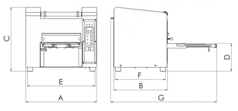 REF-0 TERMOSELLADORA SEMIAUTOMÁTICA DE BANDEJAS 280×192mm (NUEVA) | • Construida en acero inoxidable AISI 304. | • Moldes en aluminio anodizado. | • Sistema de soldadura automática. | • Alimentación del film automática. | • Señal acústica y luminosa de final de ciclo. | • Corta el film por la parte trasera. | • Panel digital con regulador de temperatura de sellado (0°C-230°C). | • Modelo compacto y robusto. | • Fácil cambio de molde en pocos segundos. | • Fácil y rápido calentamiento de la máquina. | • Permite trabajar con diferentes tipos de materiales de bandejas como PP, PET, aluminio, etc. | • Datos eléctricos: 220V/monofásica/50Hz. | • Superficie máxima de sellado: 280×192mm. | • Ancho bobina de film: 220mm. | • Potencia: 900W. | • Peso neto/bruto (kg): 49/54. | Moldes estándar: | – Multimolde para 3 medidas diferentes: | 260×192mm, 224×192mm, 137×192mm. | – 1/8 GN (168×130mm). | – 1/4 GN (160×260mm). | Se puede fabricar cualquier tipo y forma de molde acorde con las bandejas del cliente. | Dimensiones (en milímetros): | A | B | C | D | E | F | G | 525 | 395 | 480 | 350 | 465 | 340 | 770 | Vid. última imagen. | REF-0 TERMOSELLADORA SEMIAUTOMÁTICA DE BANDEJAS 280×192mm (NUEVA) | Volver al listado | Imprimir | Enviar